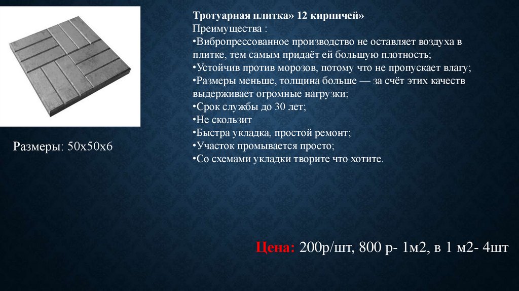 Размеры: 50х50х6Тротуарная плитка» 12 кирпичей»