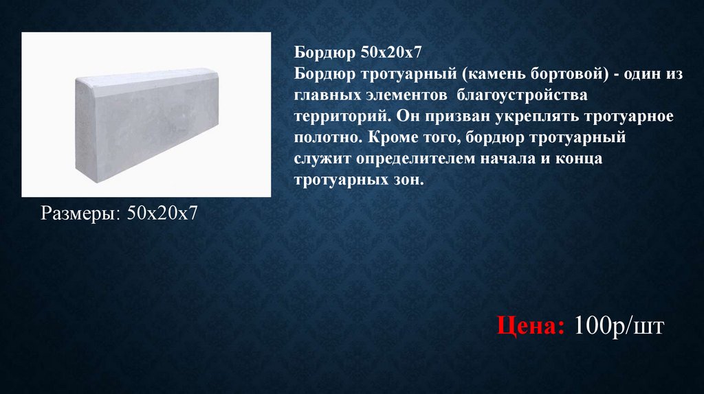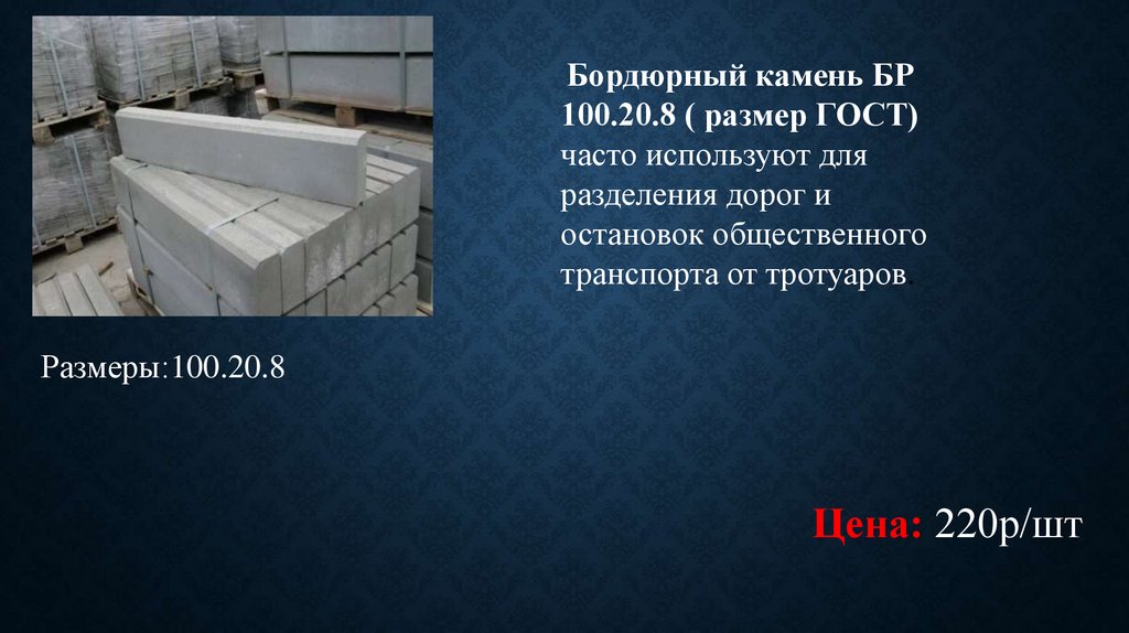 Размеры: 100.22.7,5Бетонный бортовой камень БР 100.22.7,5 также