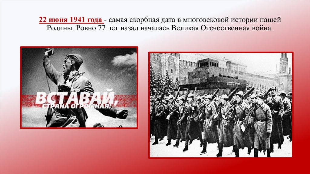 22 июня 1941 года - самая скорбная дата в многовековой истории нашейРодины. Ровно 77 лет назад началась Великая Отечественная война.
