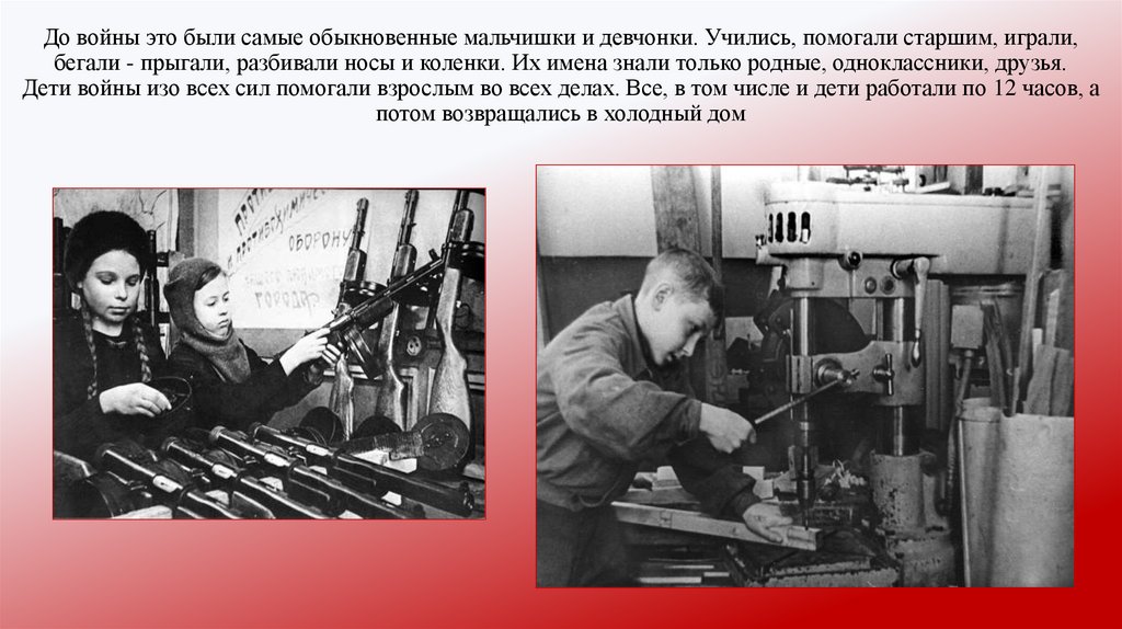 Дети войны изо всех сил помогали взрослым во всех делах. Все, в том числе и дети работали по 12 часов, а