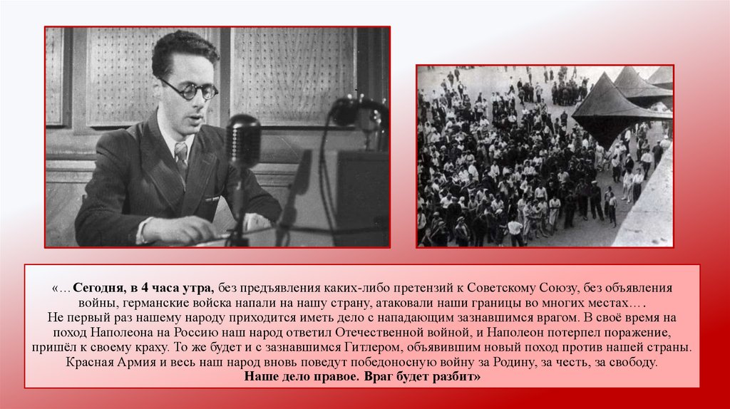 «…Сегодня, в 4 часа утра, без предъявления каких-либо претензий к Советскому Союзу, без объявлениявойны, германские войска напали на нашу страну, атаковали наши границы во многих местах….
