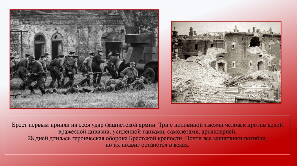 Брест первым принял на себя удар фашистской армии. Три с половиной тысячи человек против целойвражеской дивизии, усиленной танками, самолетами, артиллерией.