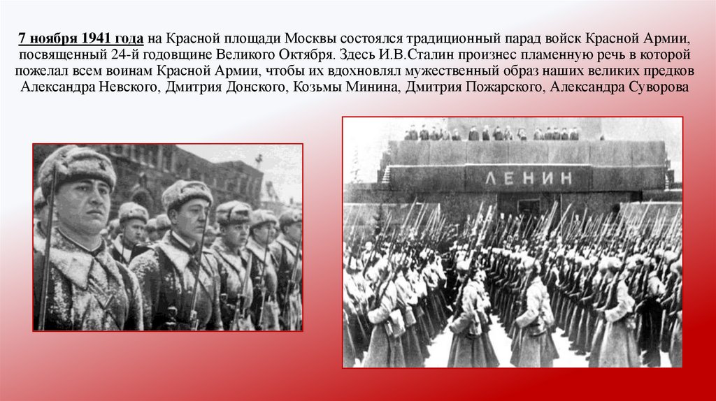 7 ноября 1941 года на Красной площади Москвы состоялся традиционный парад войск Красной Армии,посвященный 24-й годовщине Великого Октября. Здесь И.В.Сталин произнес пламенную речь в которой