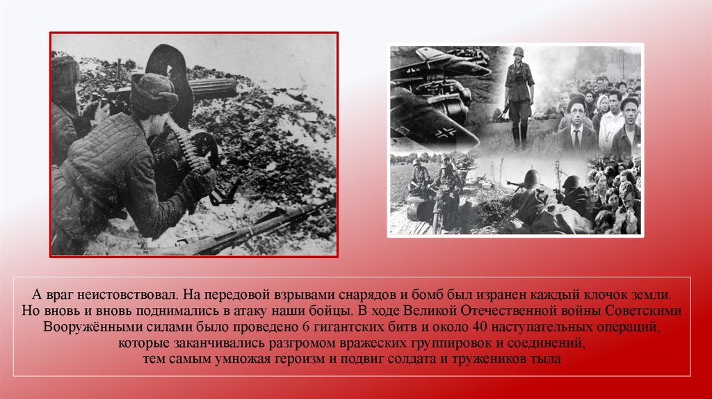 А враг неистовствовал. На передовой взрывами снарядов и бомб был изранен каждый клочок земли.Но вновь и вновь поднимались в атаку наши бойцы. В ходе Великой Отечественной войны Советскими