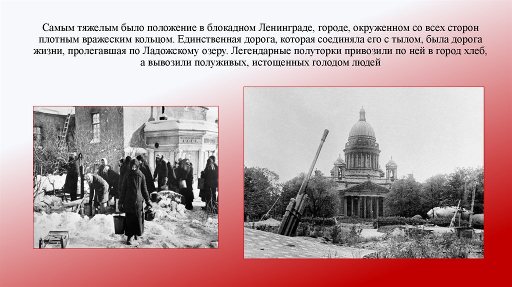 Самым тяжелым было положение в блокадном Ленинграде, городе, окруженном со всех сторонплотным вражеским кольцом. Единственная дорога, которая соединяла его с тылом, была дорога
