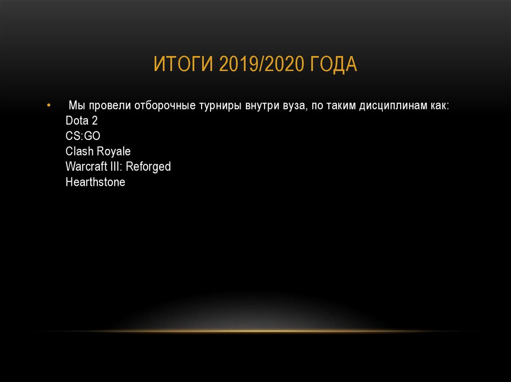 ИТОГИ 2019/2020 ГОДАМы провели отборочные турниры внутри вуза, по таким дисциплинам как: