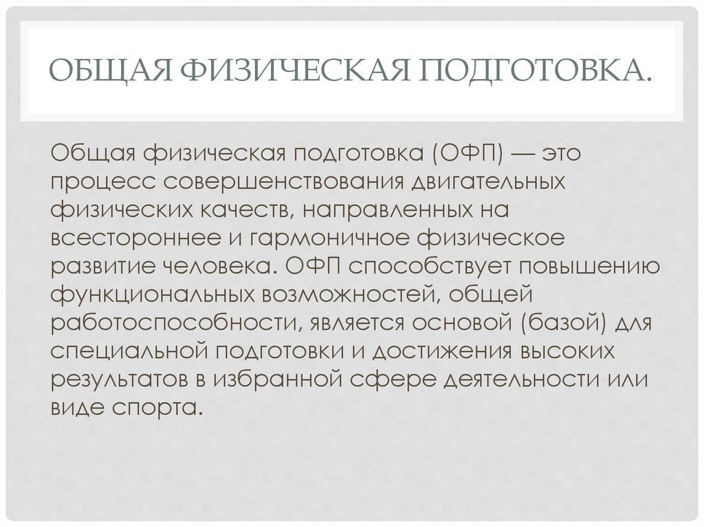 ОБЩАЯ ФИЗИЧЕСКАЯ ПОДГОТОВКА.Общая физическая подготовка (ОФП) — это