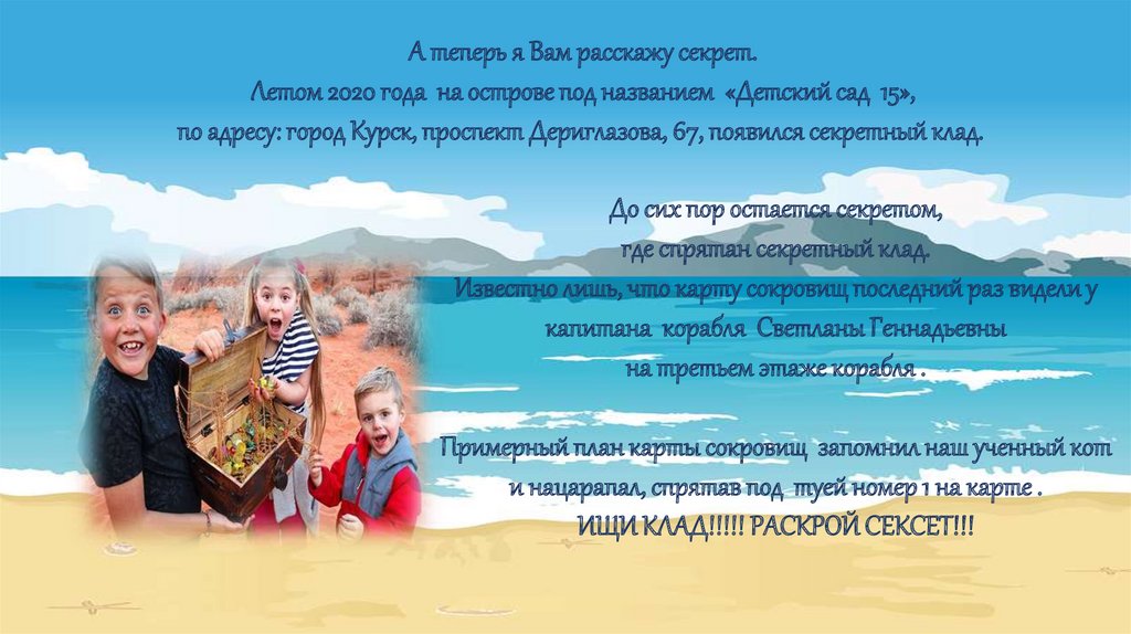 А теперь я Вам расскажу секрет.Летом 2020 года на острове под названием «Детский сад 15»,