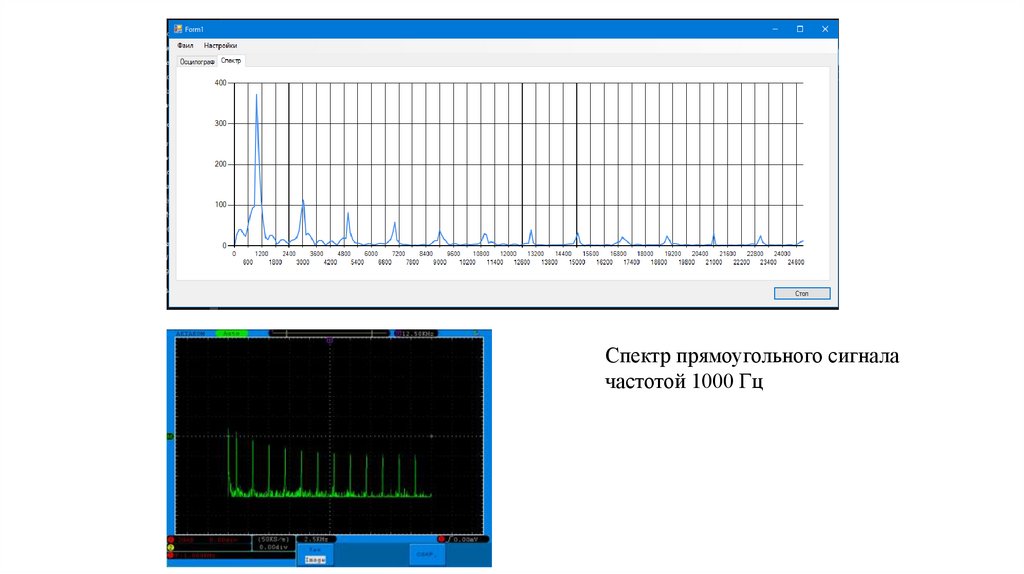 Спектр прямоугольного сигналачастотой 1000 Гц