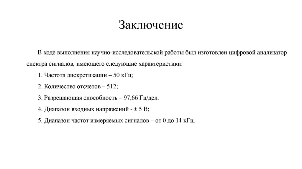 ЗаключениеВ ходе выполнения научно-исследовательской работы был изготовлен цифровой анализатор