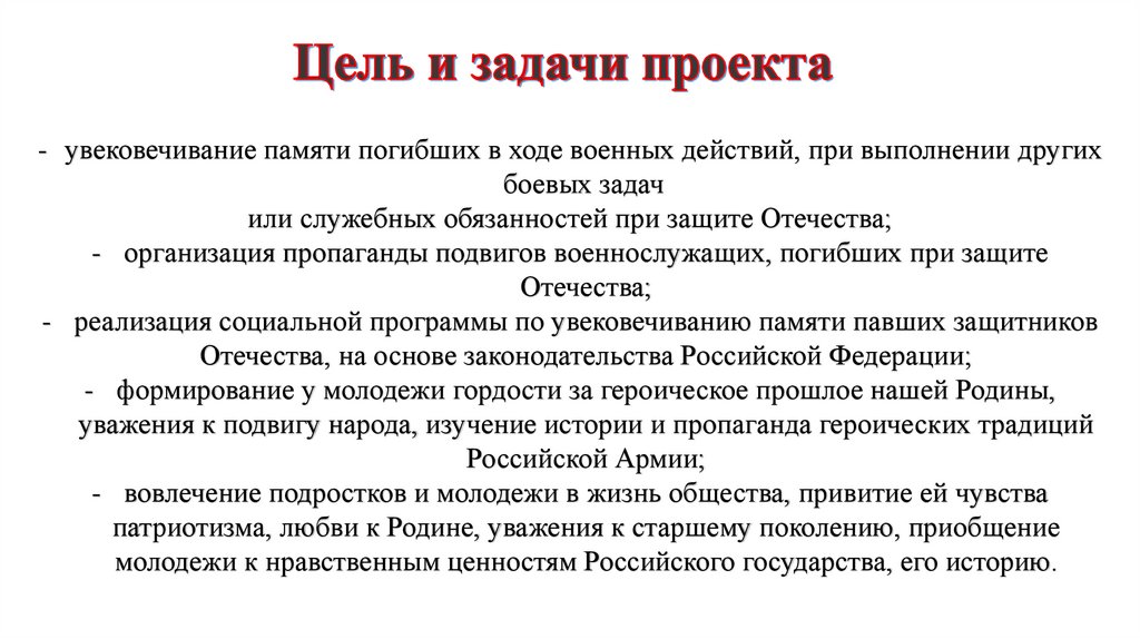 - увековечивание памяти погибших в ходе военных действий, при выполнении другихбоевых задач