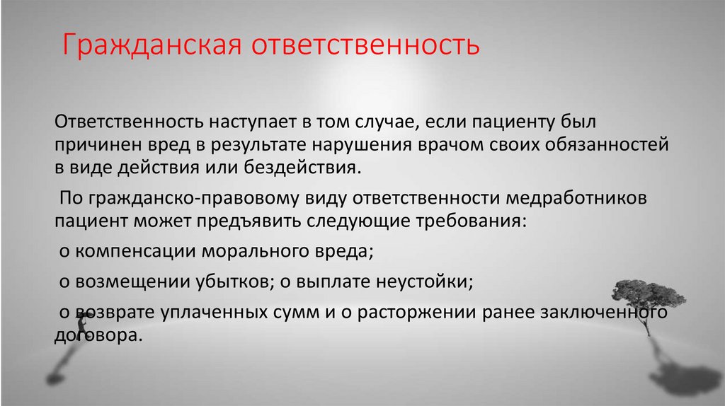 Гражданская ответственностьОтветственность наступает в том случае, если пациенту был