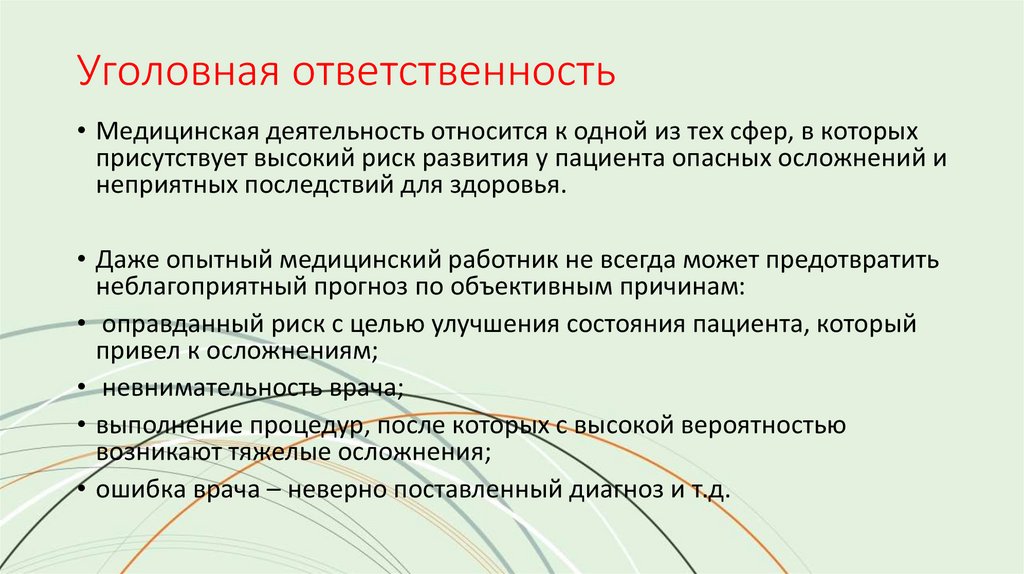 Уголовная ответственность• Медицинская деятельность относится к одной из тех сфер, в которых