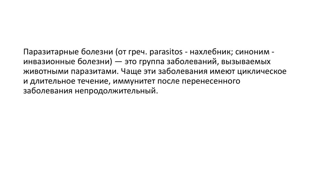 Паразитарные болезни (от греч. parasitos - нахлебник; синоним инвазионные болезни) — это группа заболеваний, вызываемыхживотными паразитами. Чаще эти заболевания имеют циклическое