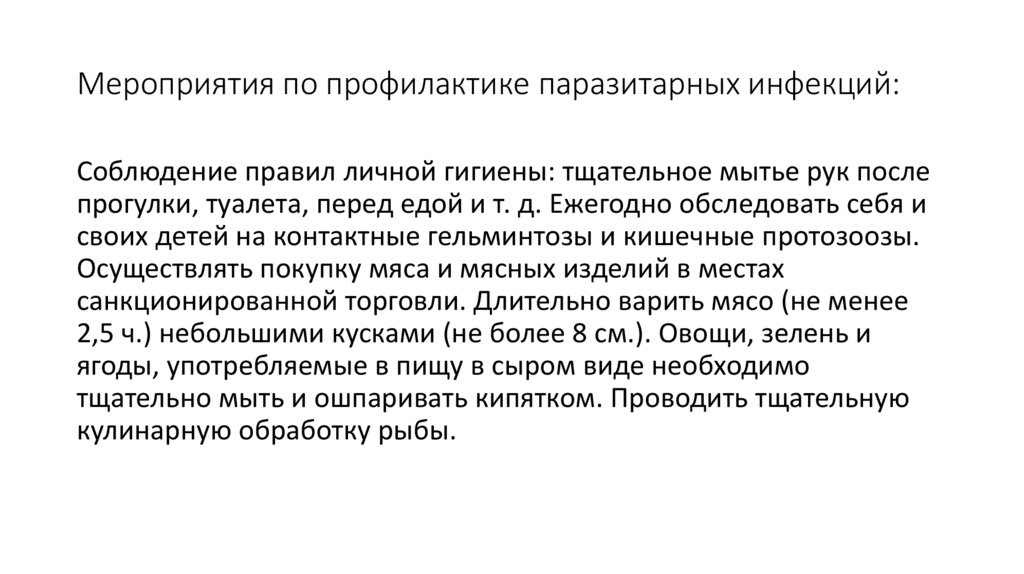 Мероприятия по профилактике паразитарных инфекций:Соблюдение правил личной гигиены: тщательное мытье рук после