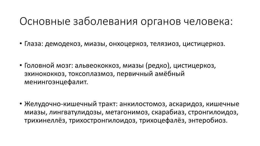 Основные заболевания органов человека:• Глаза: демодекоз, миазы, онхоцеркоз, телязиоз, цистицеркоз.