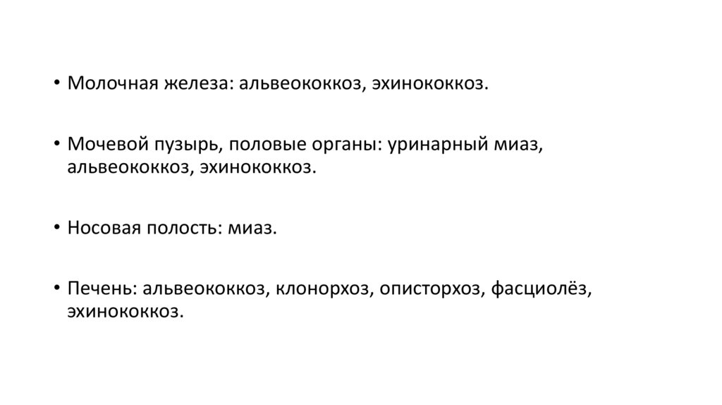 • Молочная железа: альвеококкоз, эхинококкоз.• Мочевой пузырь, половые органы: уринарный миаз,