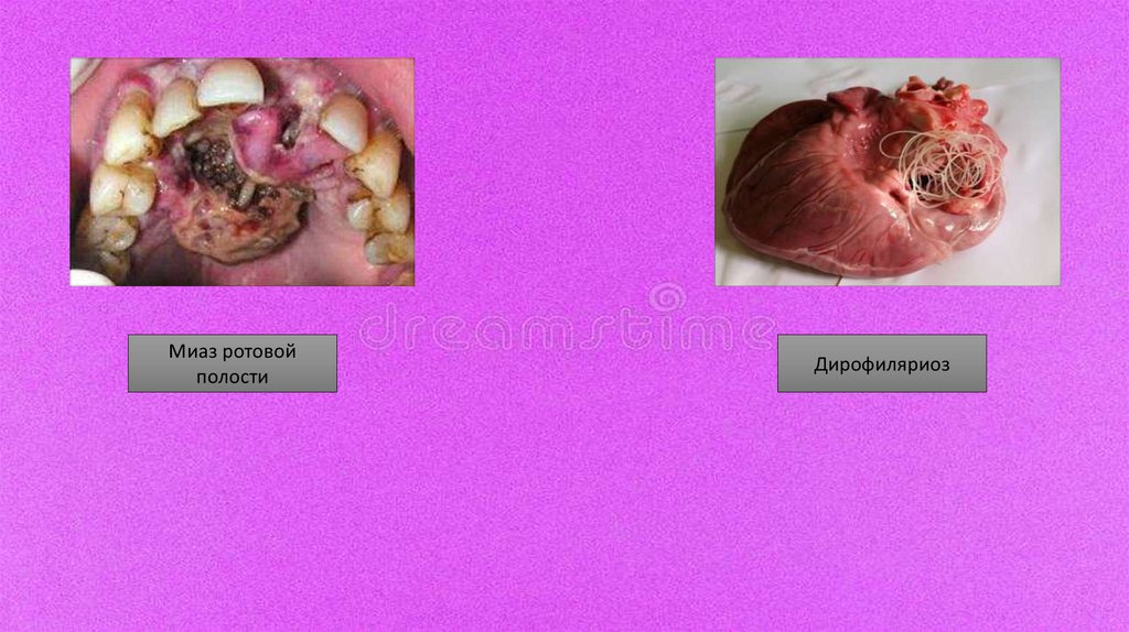 • Рот: миаз.• Сердце: дирофиляриоз, эхинококкоз.