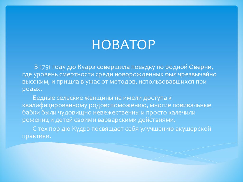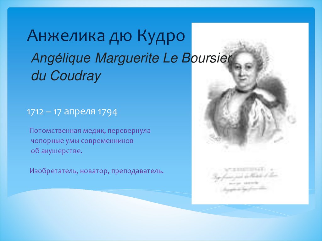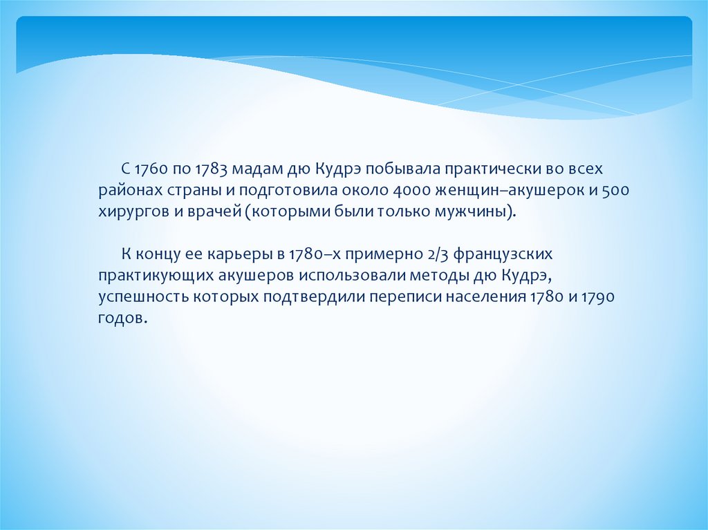С 1760 по 1783 мадам дю Кудрэ побывала практически во всехрайонах страны и подготовила около 4000 женщин–акушерок и 500