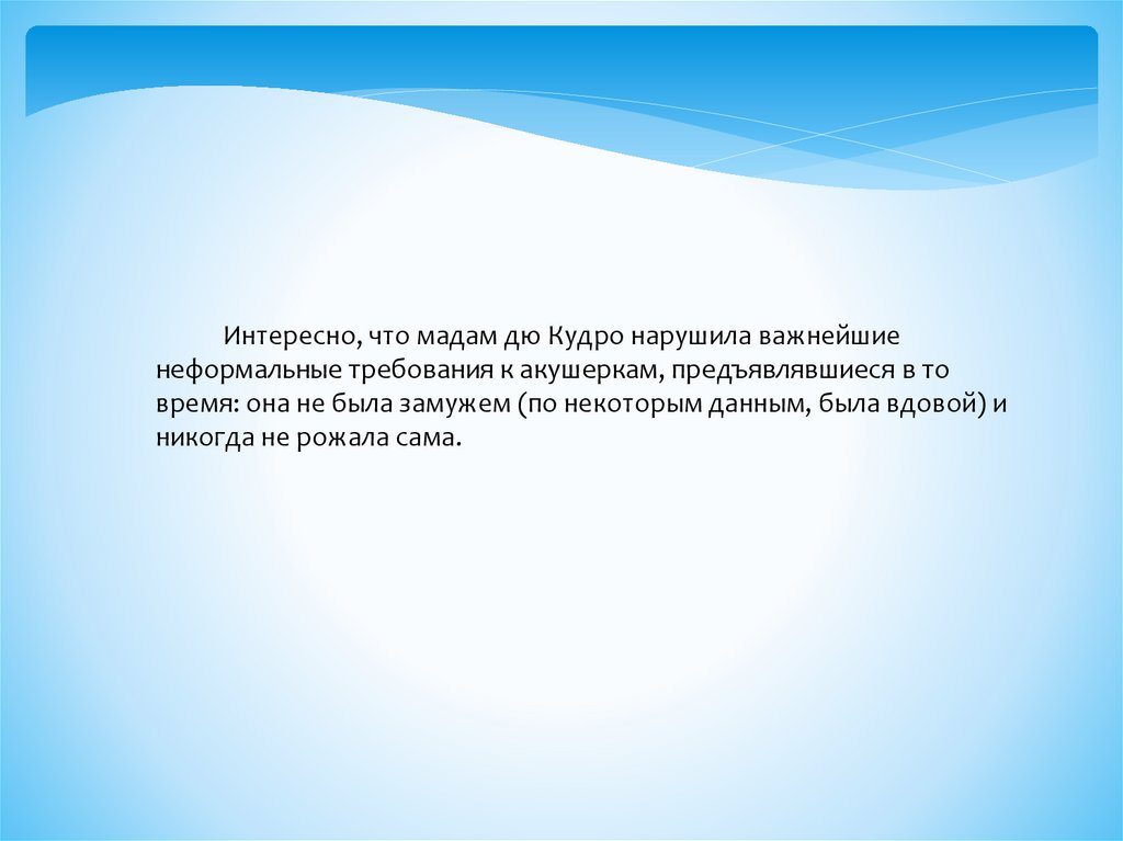 Интересно, что мадам дю Кудро нарушила важнейшиенеформальные требования к акушеркам, предъявлявшиеся в то