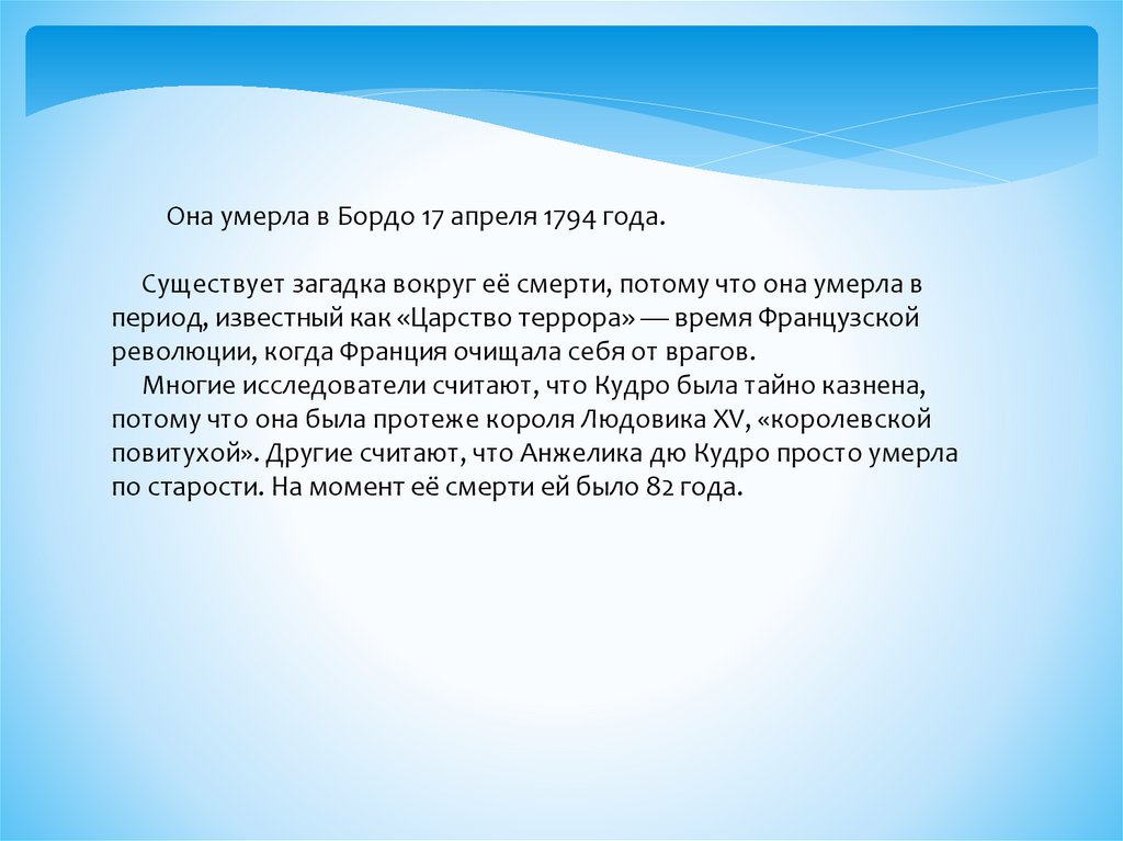 Она умерла в Бордо 17 апреля 1794 года.Существует загадка вокруг её смерти, потому что она умерла в