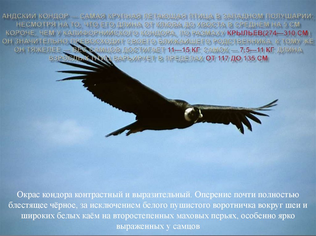 Окрас кондора контрастный и выразительный. Оперение почти полностьюблестящее чёрное, за исключением белого пушистого воротничка вокруг шеи и