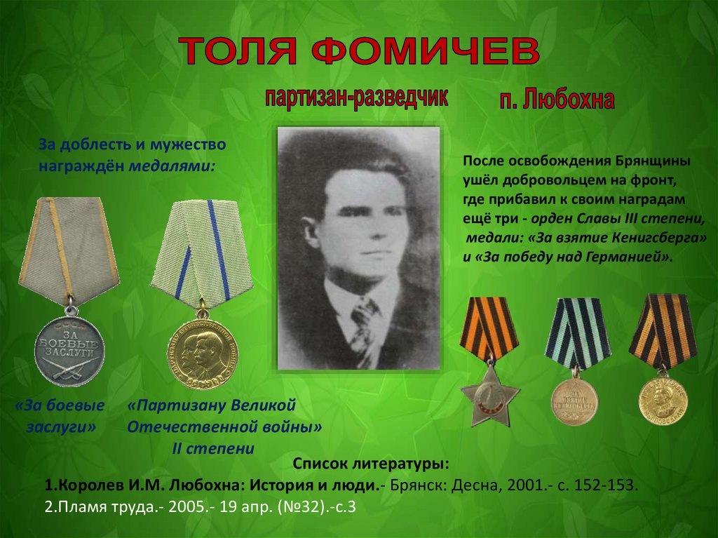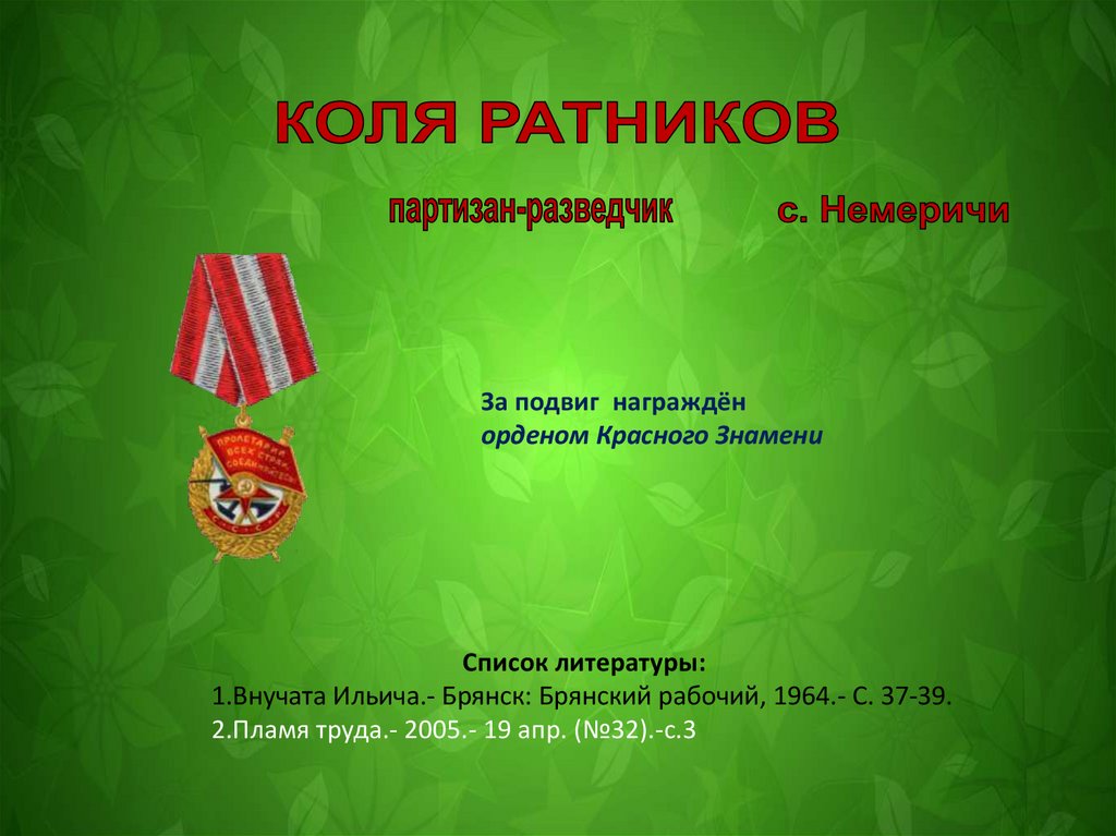 1.Бобылев Н.Г. И только память говорит.- Брянск: Придесенье,1999.- с. 45-48.