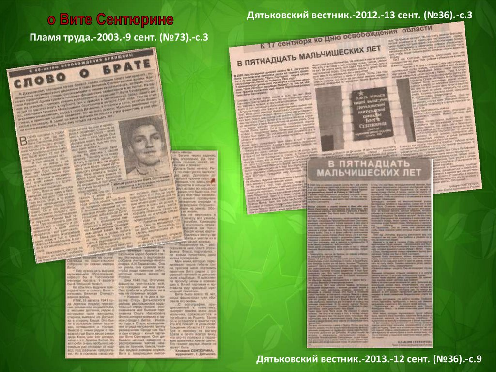 Дятьковский вестник.-2012.-13 сент. (№36).-с.3Пламя труда.-2003.-9 сент. (№73).-с.3