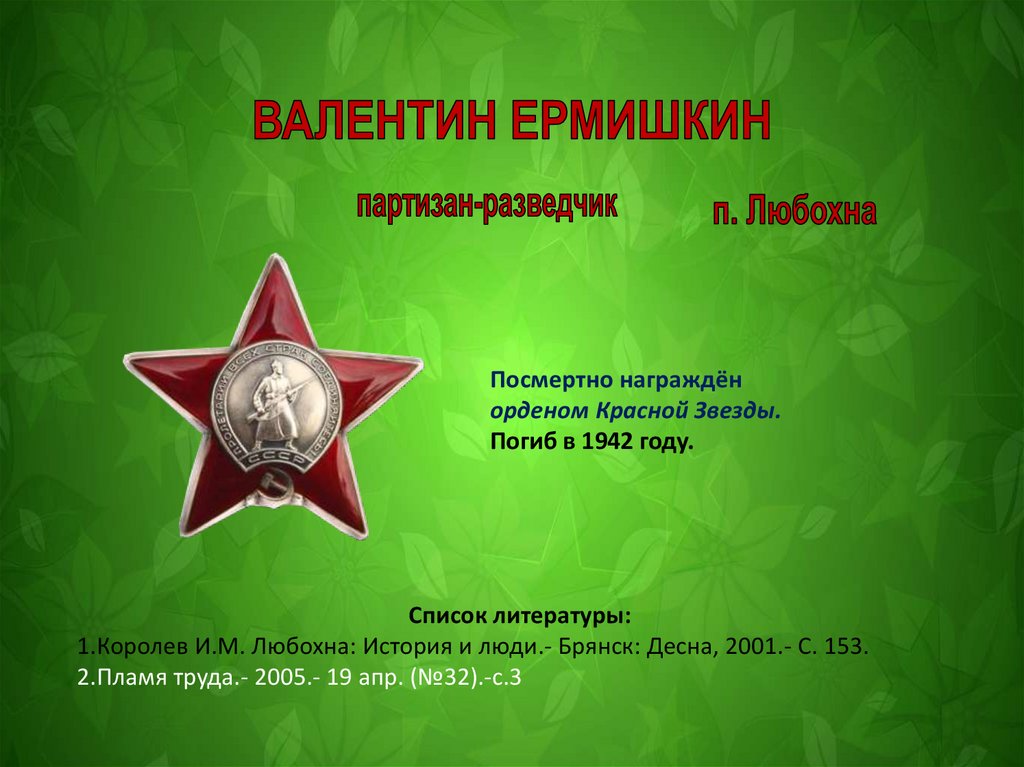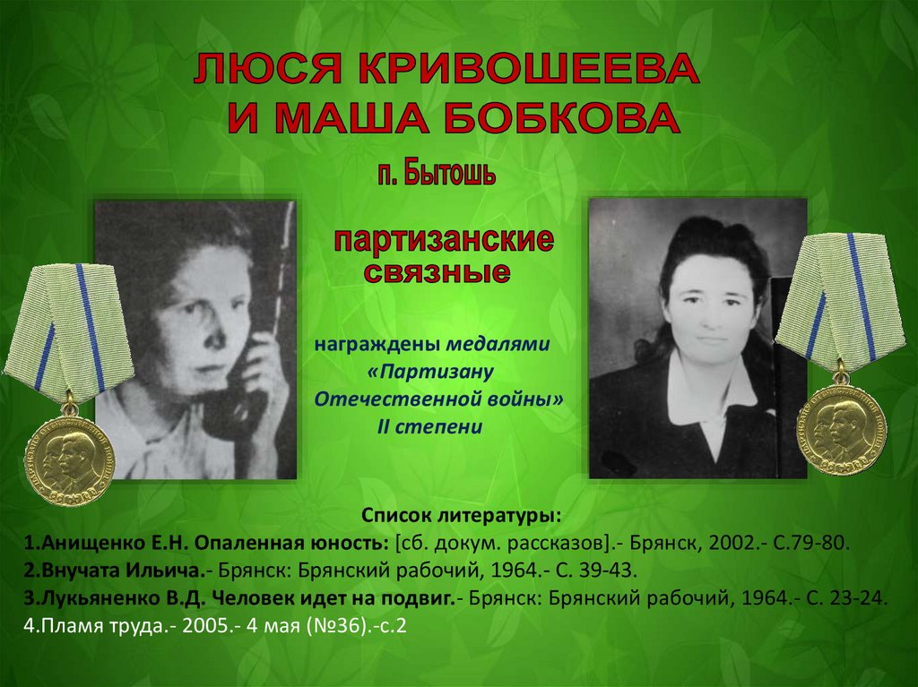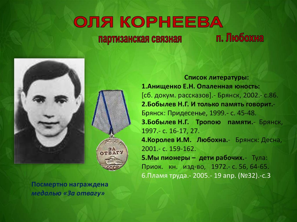 1.Анищенко Е.Н. Опаленная юность: [сб. докум. рассказов].- Брянск, 2002.- С.79-80.