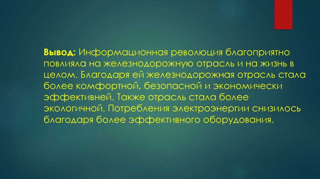 Вывод: Информационная революция благоприятноповлияла на железнодорожную отрасль и на жизнь в