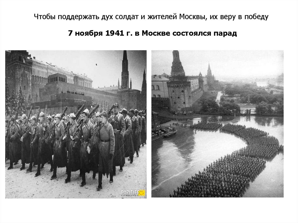 Чтобы поддержать дух солдат и жителей Москвы, их веру в победу7 ноября 1941 г. в Москве состоялся парад
