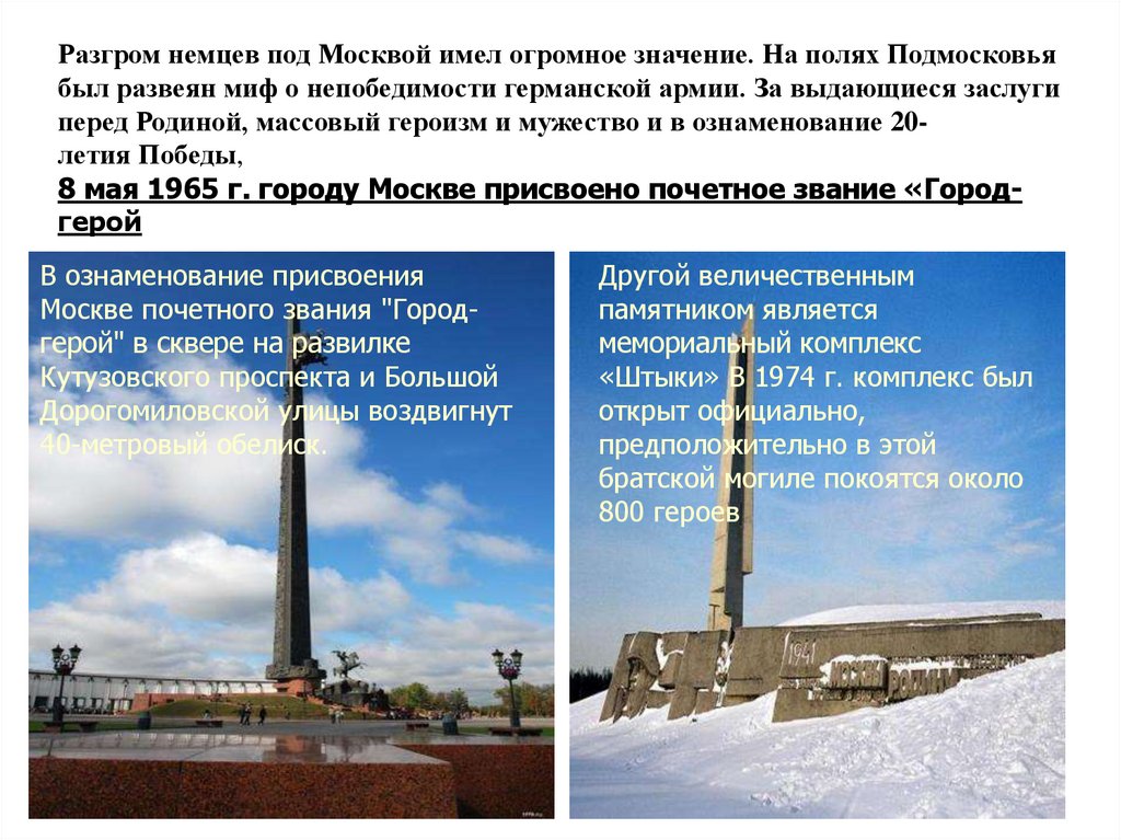 Разгром немцев под Москвой имел огромное значение. На полях Подмосковьябыл развеян миф о непобедимости германской армии. За выдающиеся заслуги
