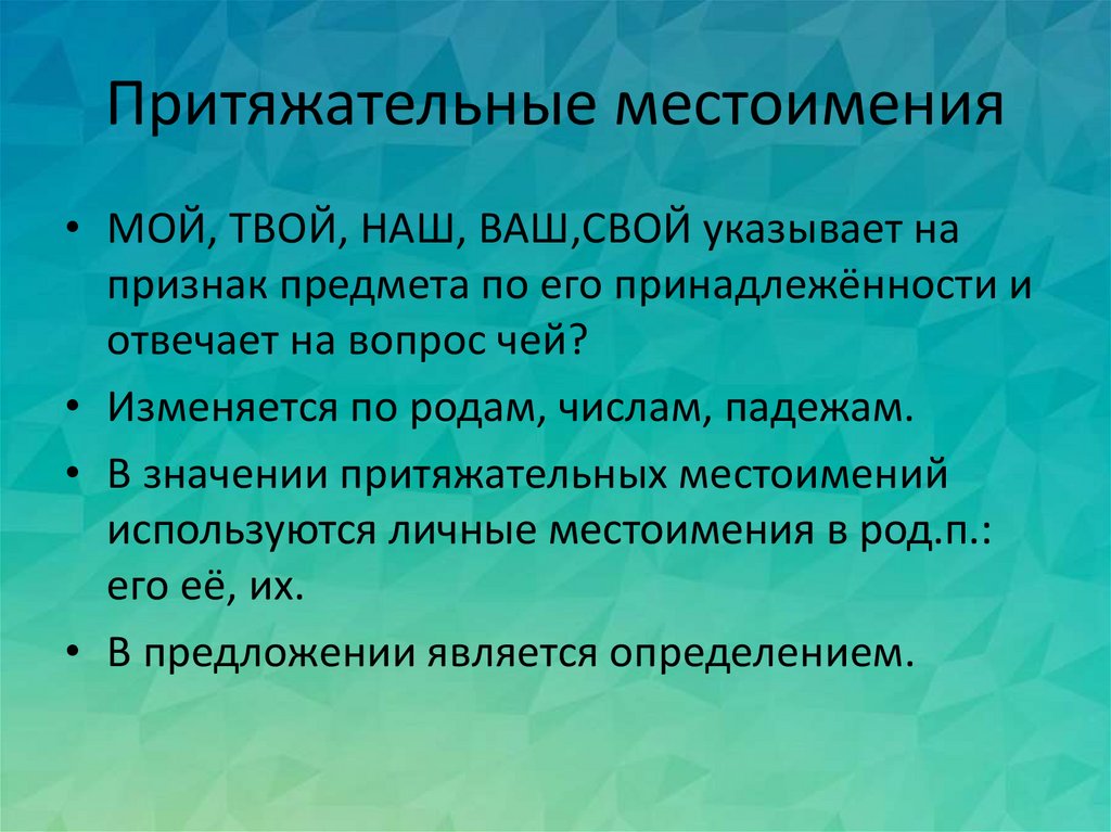 Притяжательные местоимения• МОЙ, ТВОЙ, НАШ, ВАШ,СВОЙ указывает на