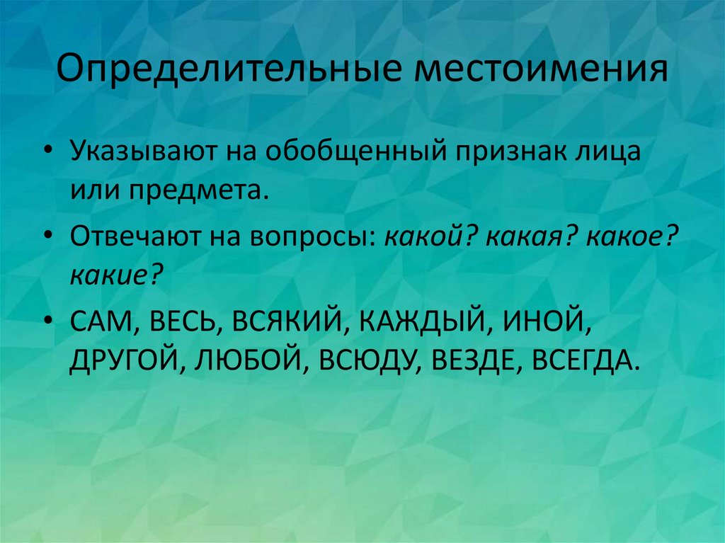 Определительные местоимения• Указывают на обобщенный признак лица