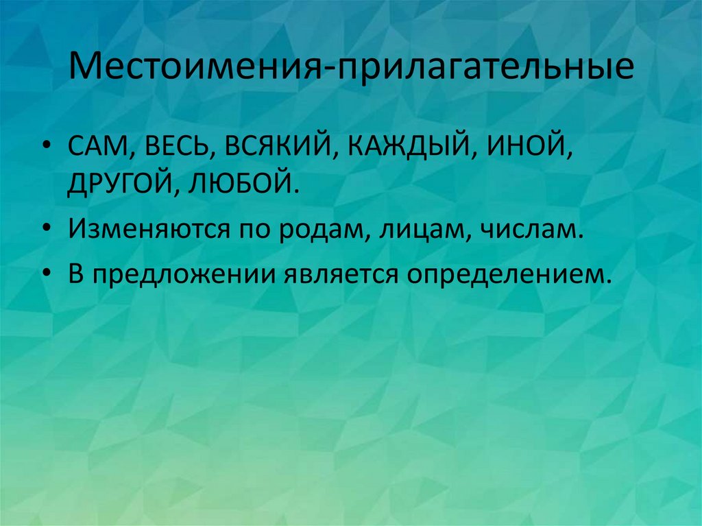 Местоимения-прилагательные• САМ, ВЕСЬ, ВСЯКИЙ, КАЖДЫЙ, ИНОЙ,