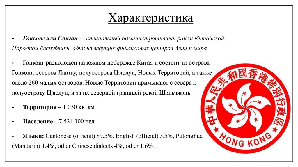 ХарактеристикаГонконг или Сянган — специальный административный район Китайской
