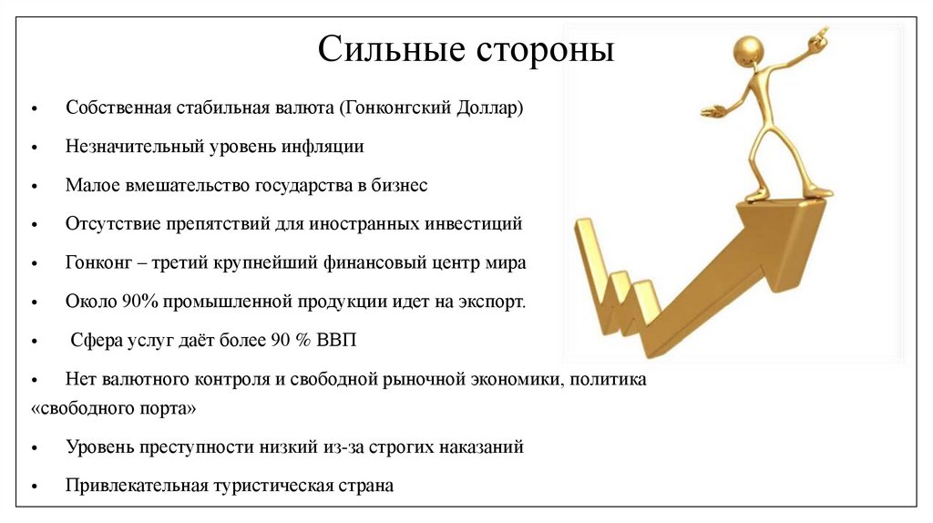 Сильные стороныСобственная стабильная валюта (Гонконгский Доллар)