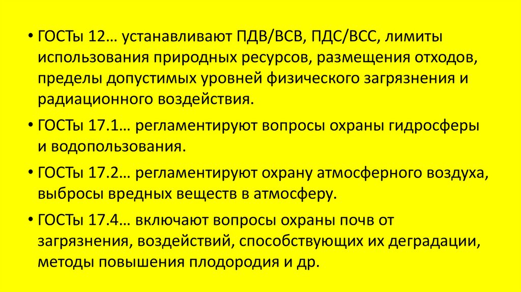 • ГОСТы 12… устанавливают ПДВ/ВСВ, ПДС/ВСС, лимитыиспользования природных ресурсов, размещения отходов,
