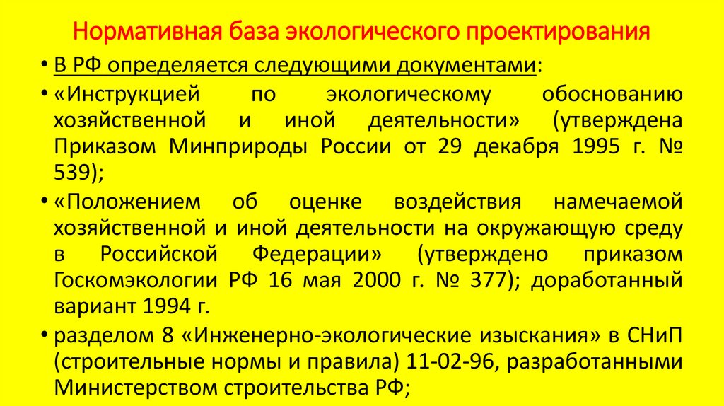Нормативная база экологического проектирования• В РФ определяется следующими документами: