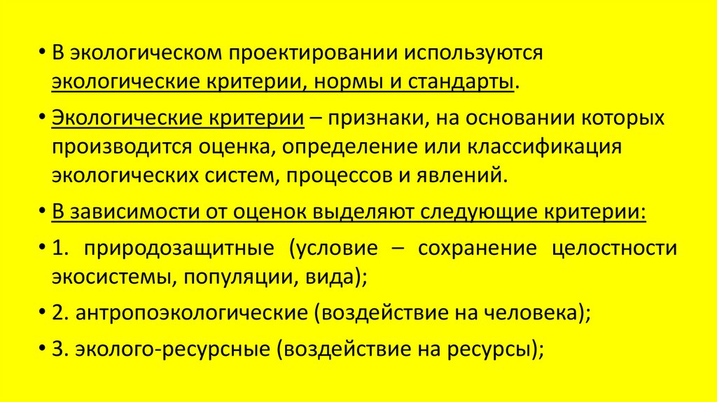 • В экологическом проектировании используютсяэкологические критерии, нормы и стандарты.