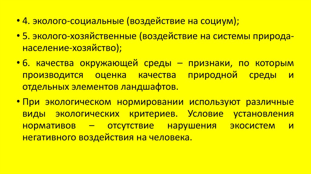 • 4. эколого-социальные (воздействие на социум);• 5. эколого-хозяйственные (воздействие на системы природанаселение-хозяйство);