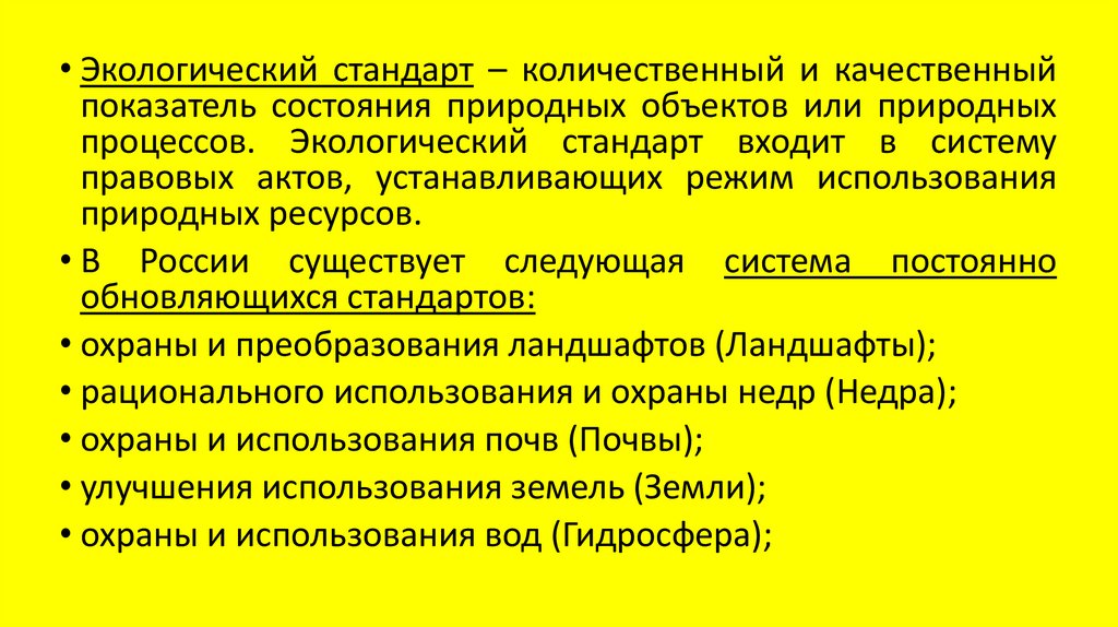 • Экологический стандарт – количественный и качественныйпоказатель состояния природных объектов или природных