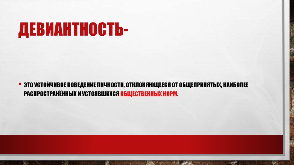 ДЕВИАНТНОСТЬ• ЭТО УСТОЙЧИВОЕ ПОВЕДЕНИЕ ЛИЧНОСТИ, ОТКЛОНЯЮЩЕЕСЯ ОТ ОБЩЕПРИНЯТЫХ, НАИБОЛЕЕРАСПРОСТРАНЁННЫХ И УСТОЯВШИХСЯ ОБЩЕСТВЕННЫХ НОРМ.
