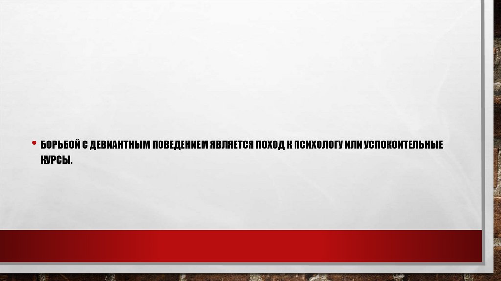 • БОРЬБОЙ С ДЕВИАНТНЫМ ПОВЕДЕНИЕМ ЯВЛЯЕТСЯ ПОХОД К ПСИХОЛОГУ ИЛИ УСПОКОИТЕЛЬНЫЕКУРСЫ.