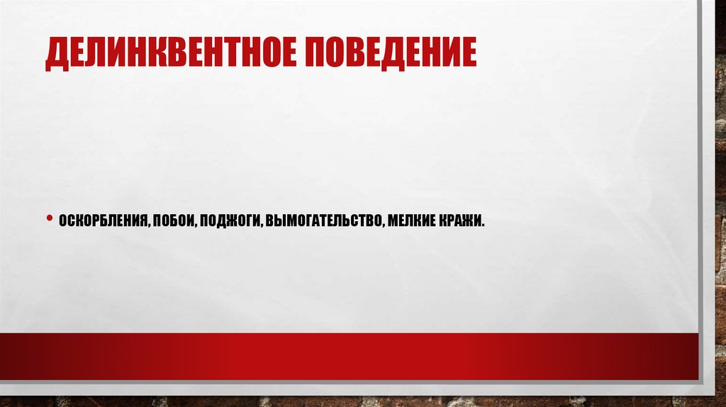 ДЕЛИНКВЕНТНОЕ ПОВЕДЕНИЕ• ОСКОРБЛЕНИЯ, ПОБОИ, ПОДЖОГИ, ВЫМОГАТЕЛЬСТВО, МЕЛКИЕ КРАЖИ.