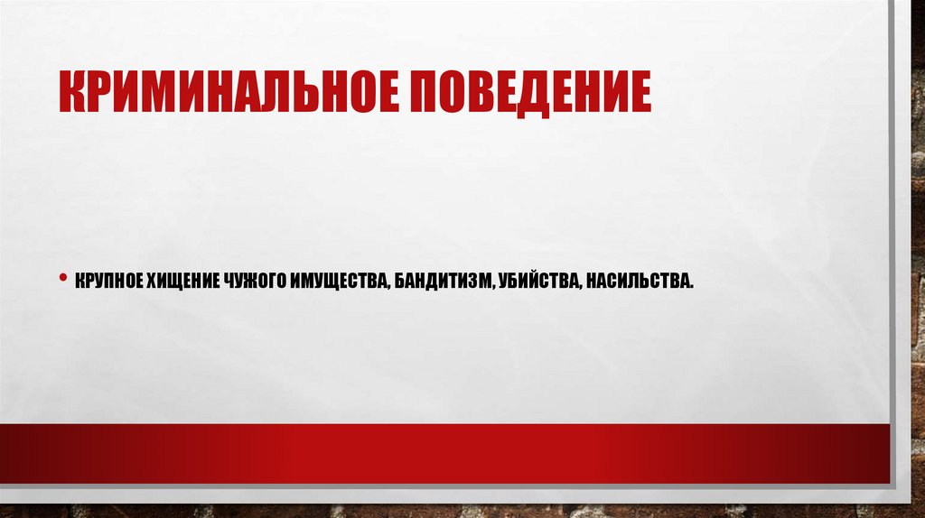 КРИМИНАЛЬНОЕ ПОВЕДЕНИЕ• КРУПНОЕ ХИЩЕНИЕ ЧУЖОГО ИМУЩЕСТВА, БАНДИТИЗМ, УБИЙСТВА, НАСИЛЬСТВА.