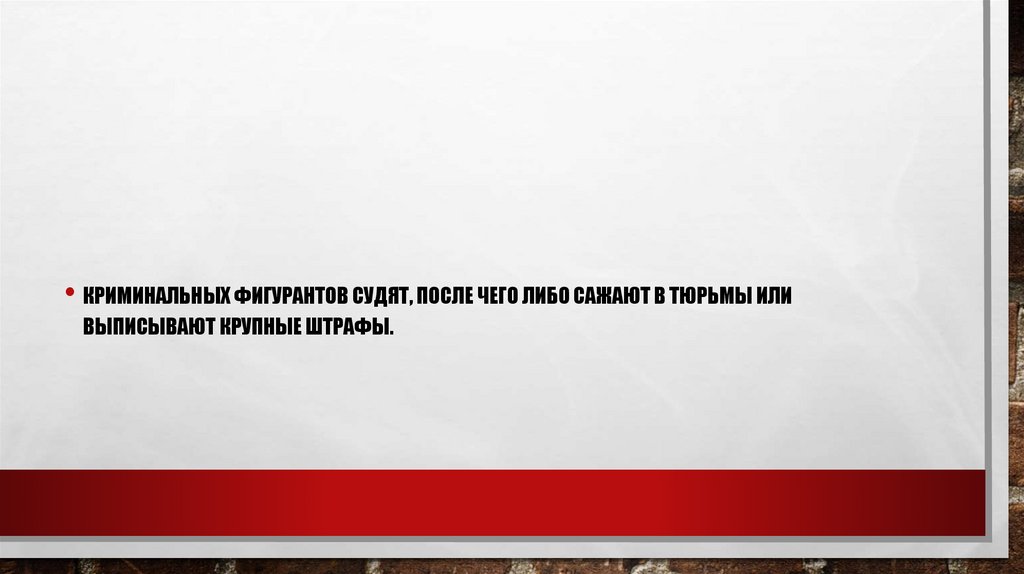 • КРИМИНАЛЬНЫХ ФИГУРАНТОВ СУДЯТ, ПОСЛЕ ЧЕГО ЛИБО САЖАЮТ В ТЮРЬМЫ ИЛИВЫПИСЫВАЮТ КРУПНЫЕ ШТРАФЫ.