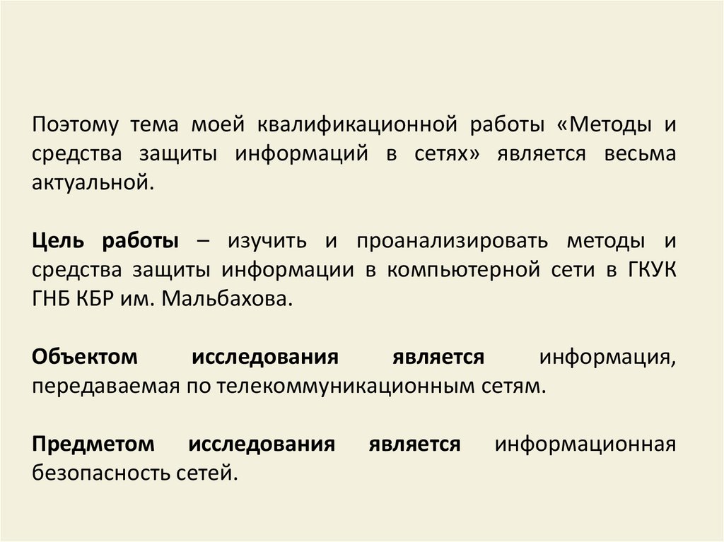 Поэтому тема моей квалификационной работы «Методы исредства защиты информаций в сетях» является весьма
