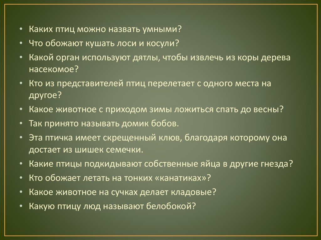 • Каких птиц можно назвать умными?• Что обожают кушать лоси и косули?