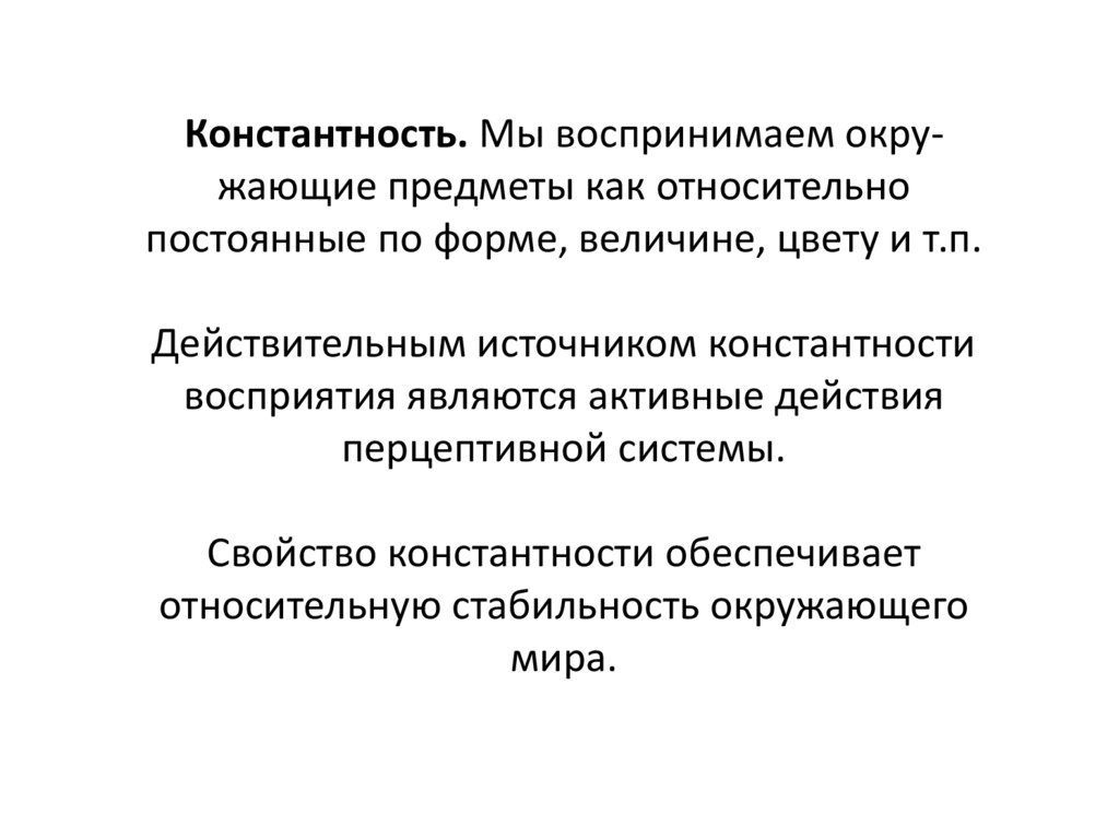 Константность. Мы воспринимаем окружающие предметы как относительнопостоянные по форме, величине, цвету и т.п.